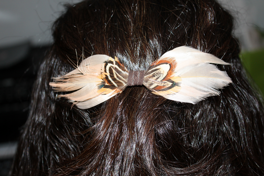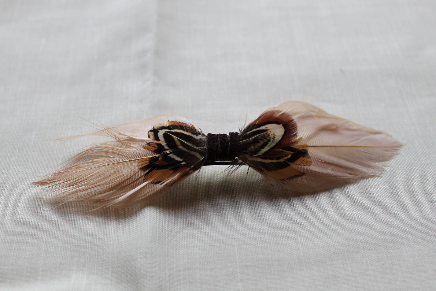 cream and brown bow made completely out of feathers and suede lace, on metal hair clip. hand-made and one of a kind.