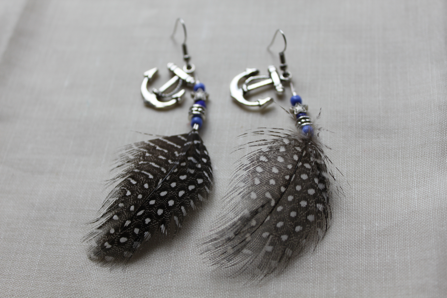 spotted black and white feathers, each adorned with blue seed beads and metal beads and an anchor charm that falls in front of the beads, on metal earring hooks. hand-made and one of a kind.
