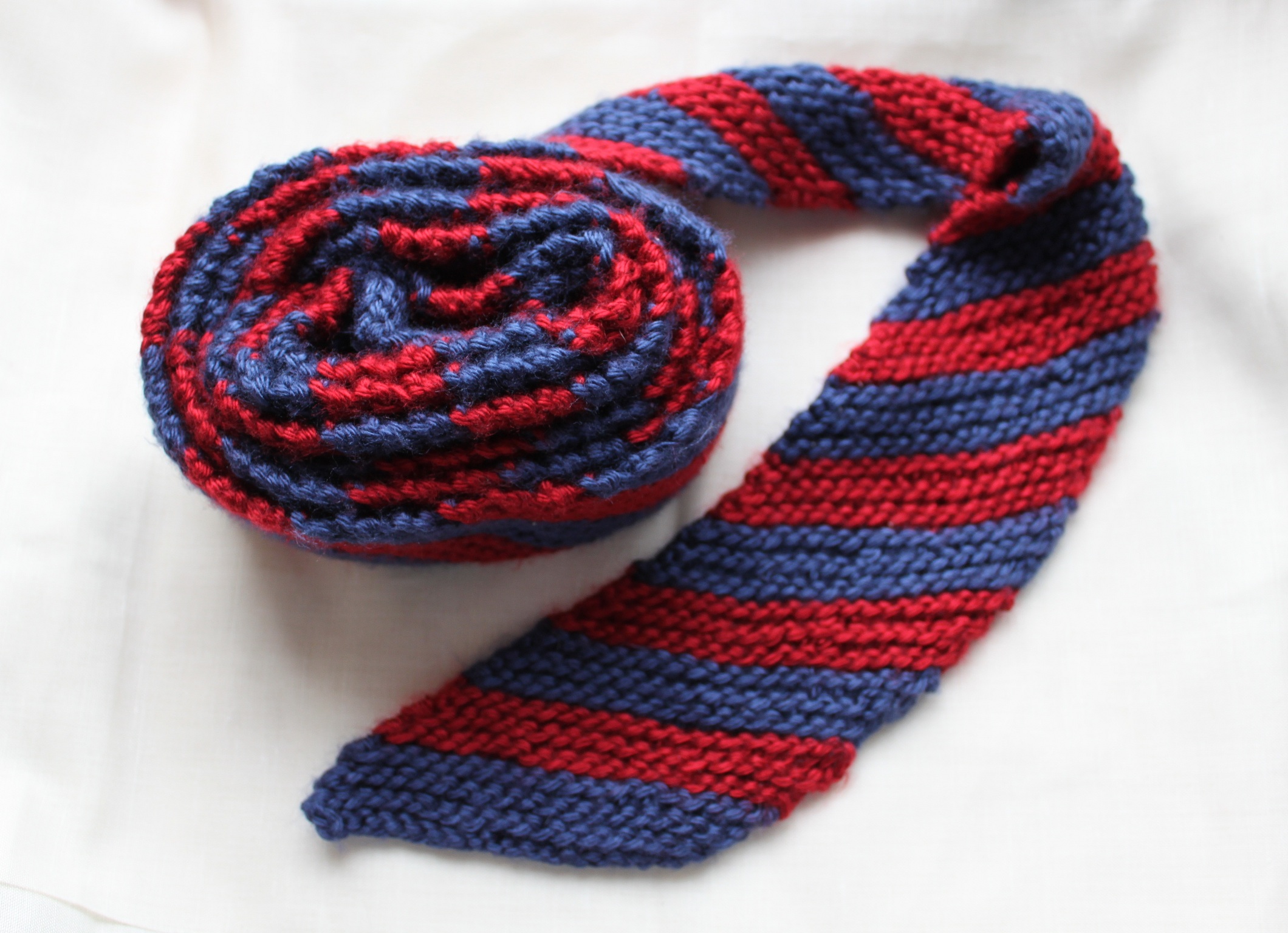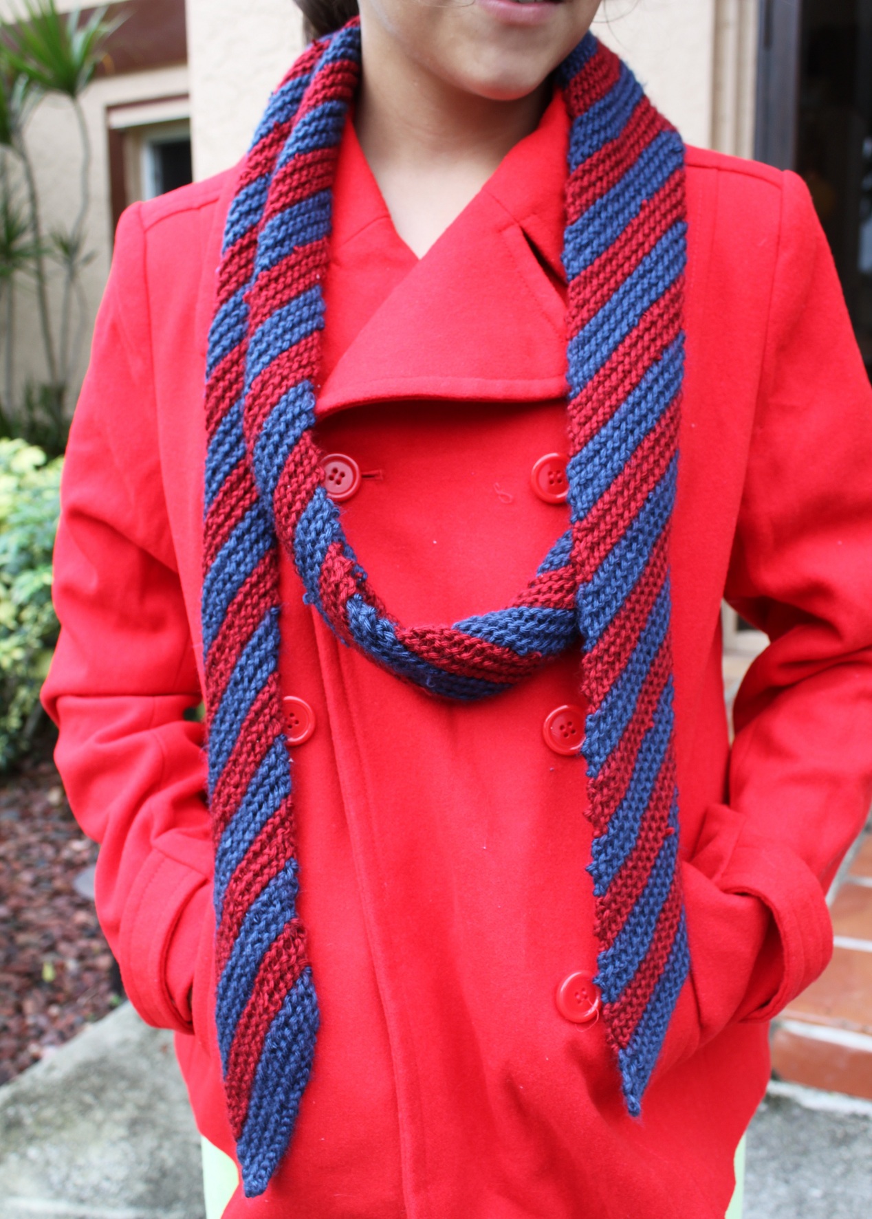 pattycakes' first glee inspired knit, this diagonal-striped scarf measures 260 cm (102.4 in) and will keep you warm as you jam along to the warblers!