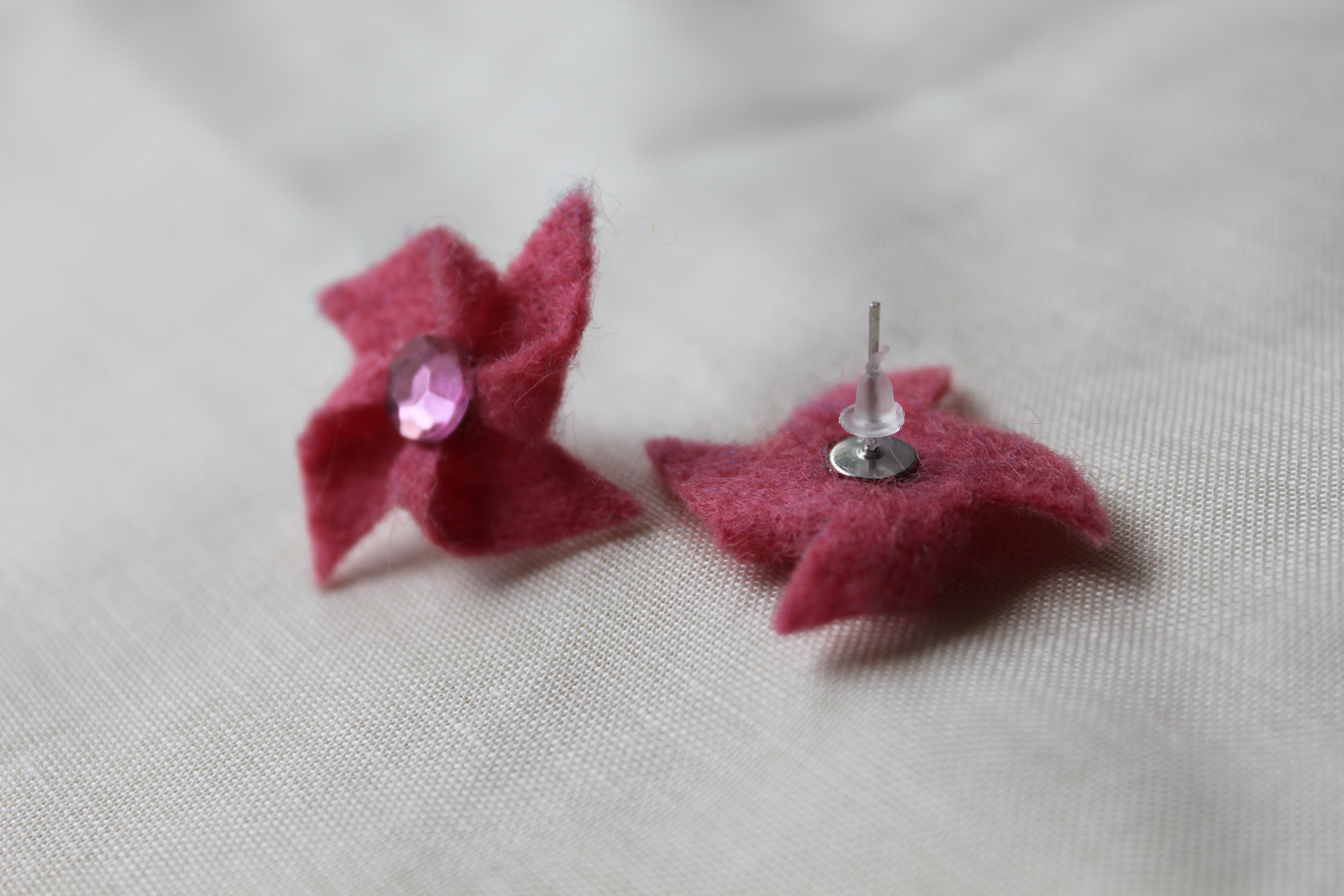 Pink felt pinwheels with pink rhinestones on nickel-free posts. Hand-made and one of a kind.