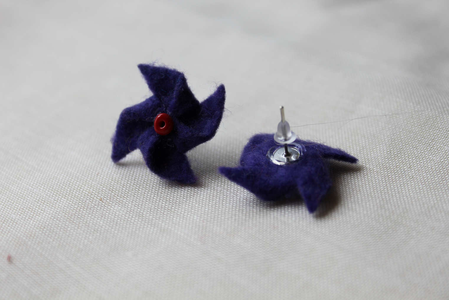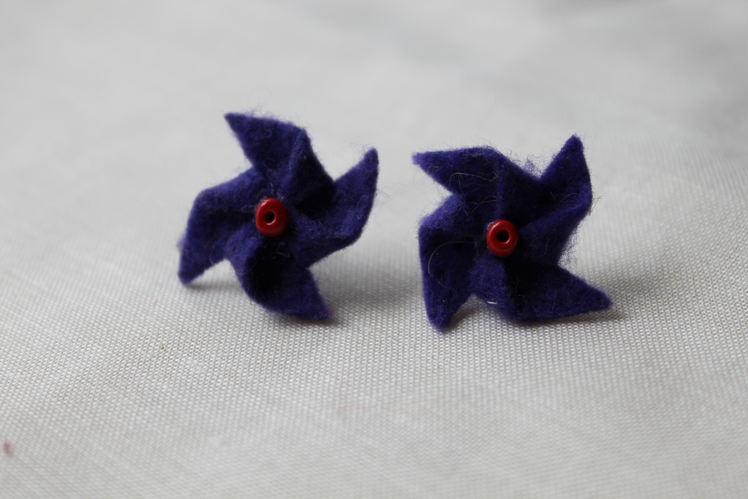 Purple felt pinwheels with red beads on nickel-free posts. Hand-made and one of a kind.
