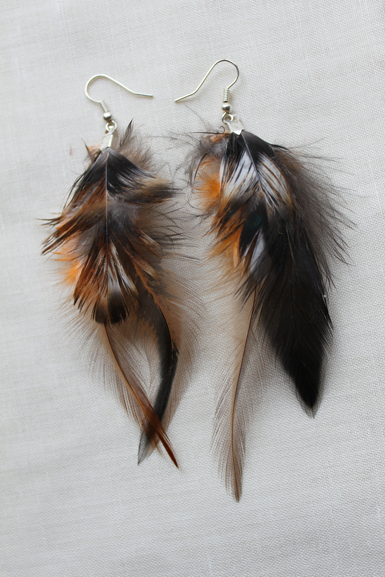 mixed, grizzly rooster feathers in warm, earthy tones on metal earring hooks. hand-made and one of a kind.