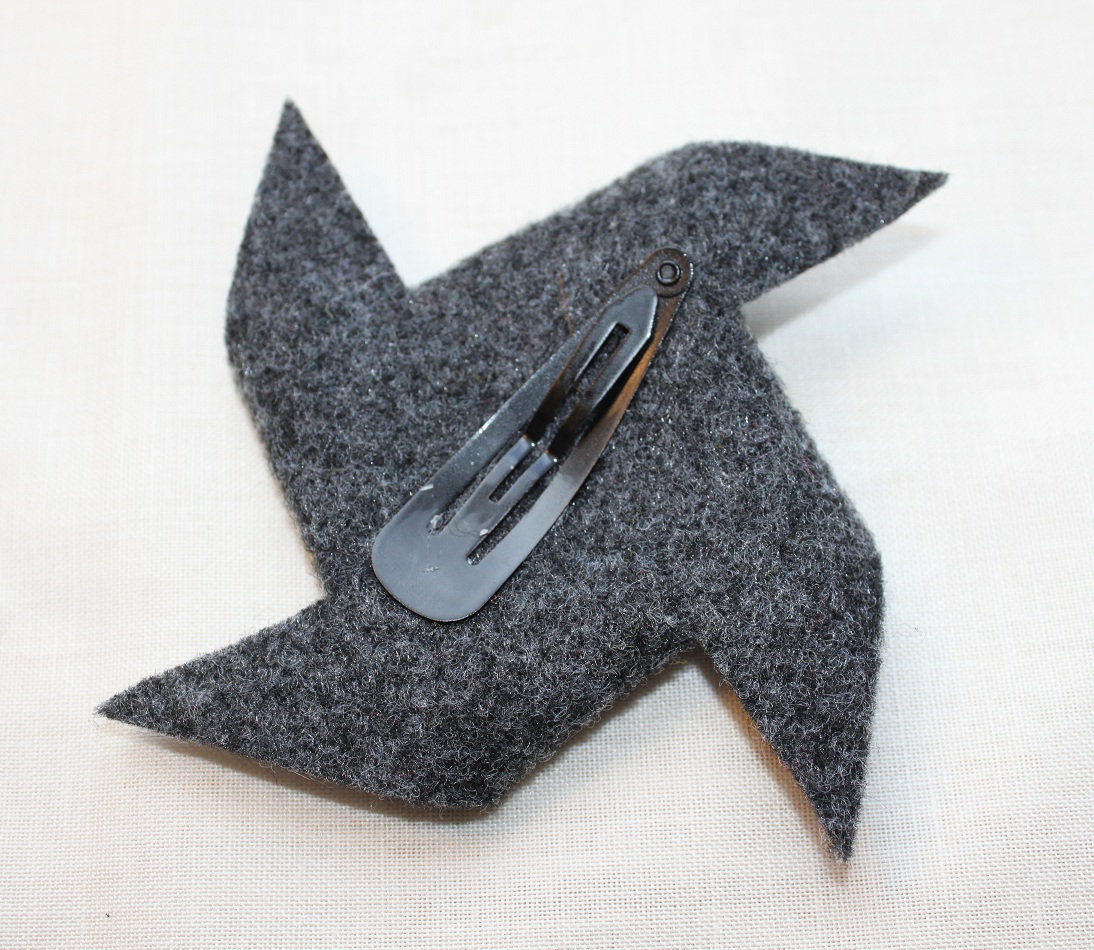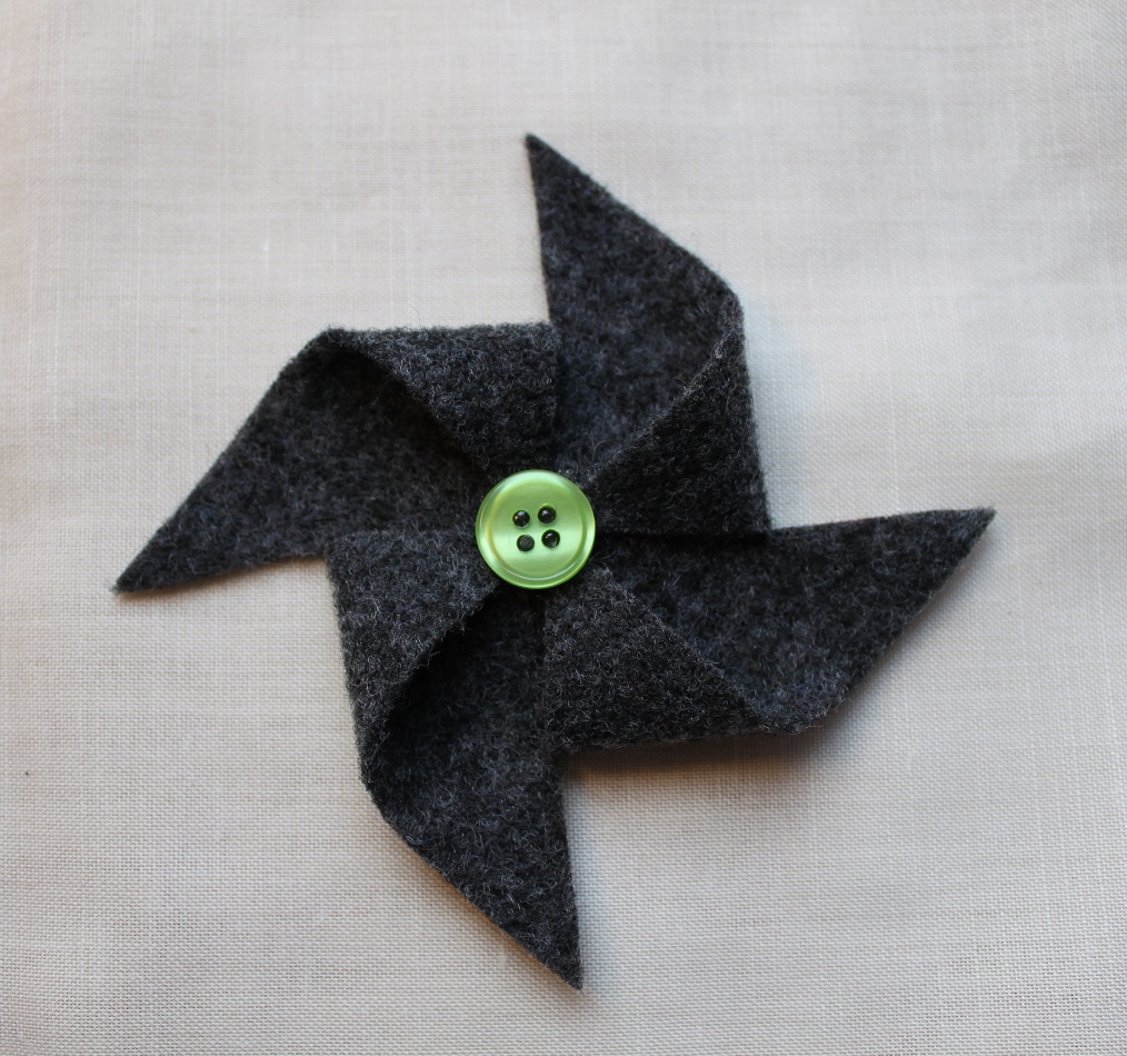 grey felt pinwheel with light green button on a black clip. hand-made and one of a kind.