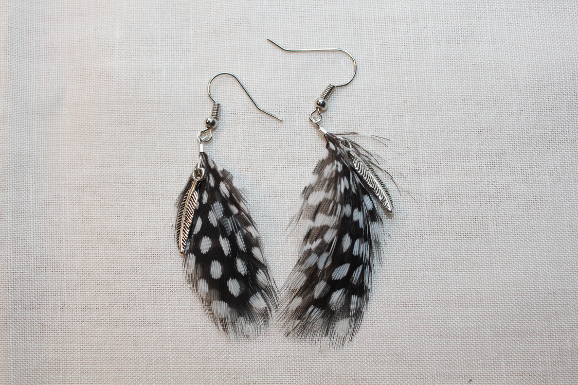 spotted black and white feathers adorned with silver feather charms, on metal earring hooks. hand-made and one of a kind.