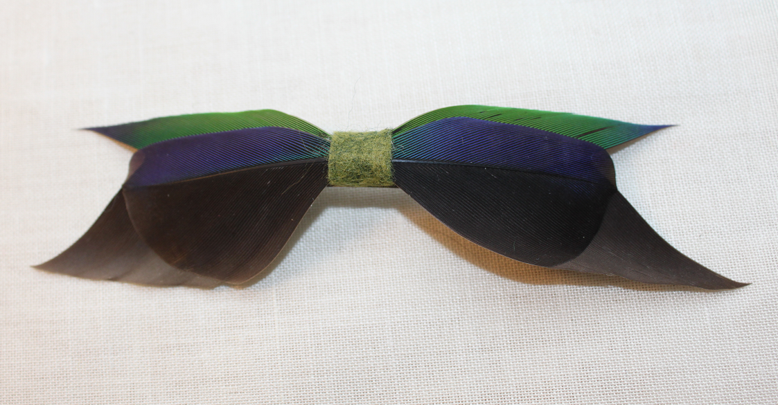 black, blue, and green bow made completely out of all-natural, violence-free parrot feathers and wool felt, on metal hair clip. hand-made and one of a kind.