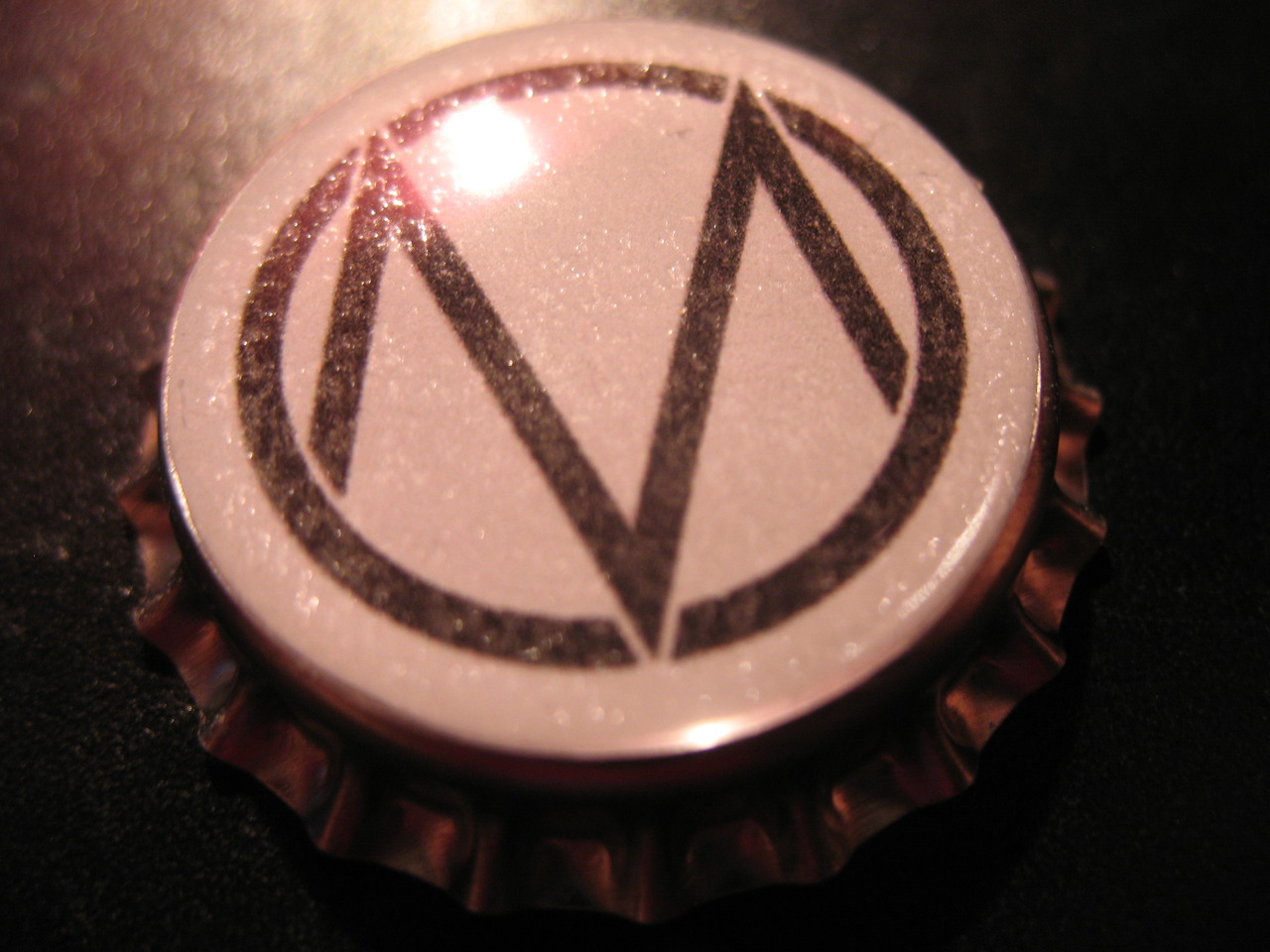the maine's black and white m logo. hand-cut and sealed with epoxy resin. waterproof (still, try to avoid wetting it!). made with silver crown bottle caps, on an 18" metal ball chain as a necklace, or a 6" metal ball chain as a keychain, or as a pin (flattened bottle cap) or ring (flattened bottle cap on adjustable size ring).